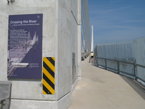 1: Bicyclists access the bridge on a pathway from the West Coast Express station at Maple Meadows. The path runs along the east side of Golden Ears Way.
